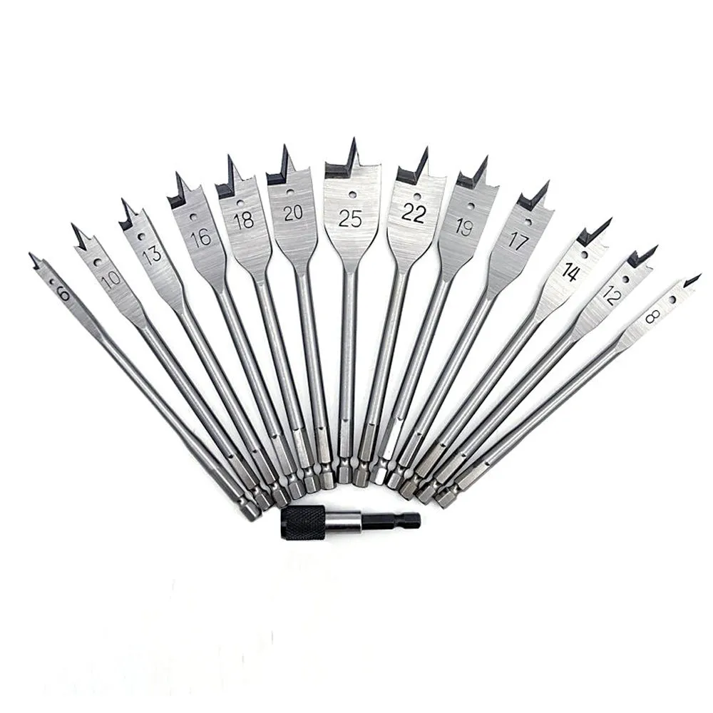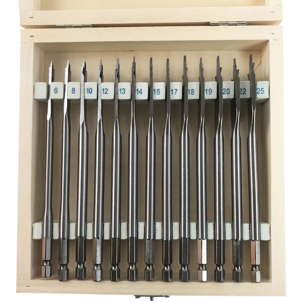 13 piece flat wood drill bit set with three point cutting and extended spurs. Sizes 6, 8, 10, 12, 13, 14, 16, 17, 18, 19, 20, 22, 25mm. ¼” hex shank. Length 150mm. Complete with 60mm quick change adaptor