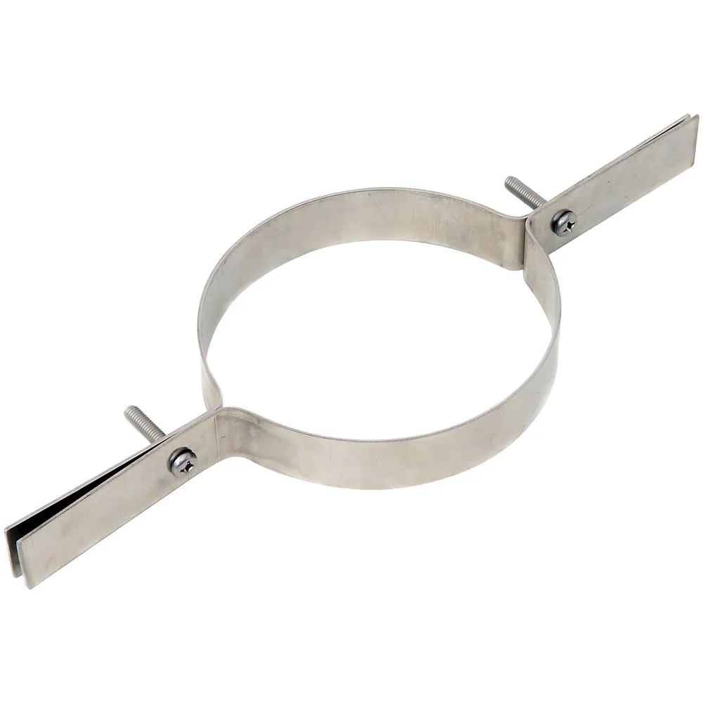 Clamping bracket for fixing flexible flue liner. This item is used in conjunction with a fixing plate to suspend the liner from the chimney pot. The plate is placed beneath the chimney pot and the clamping bracket placed on top. The bracket then clamps securely around the outside of the flexible flue to hold the flue in position.