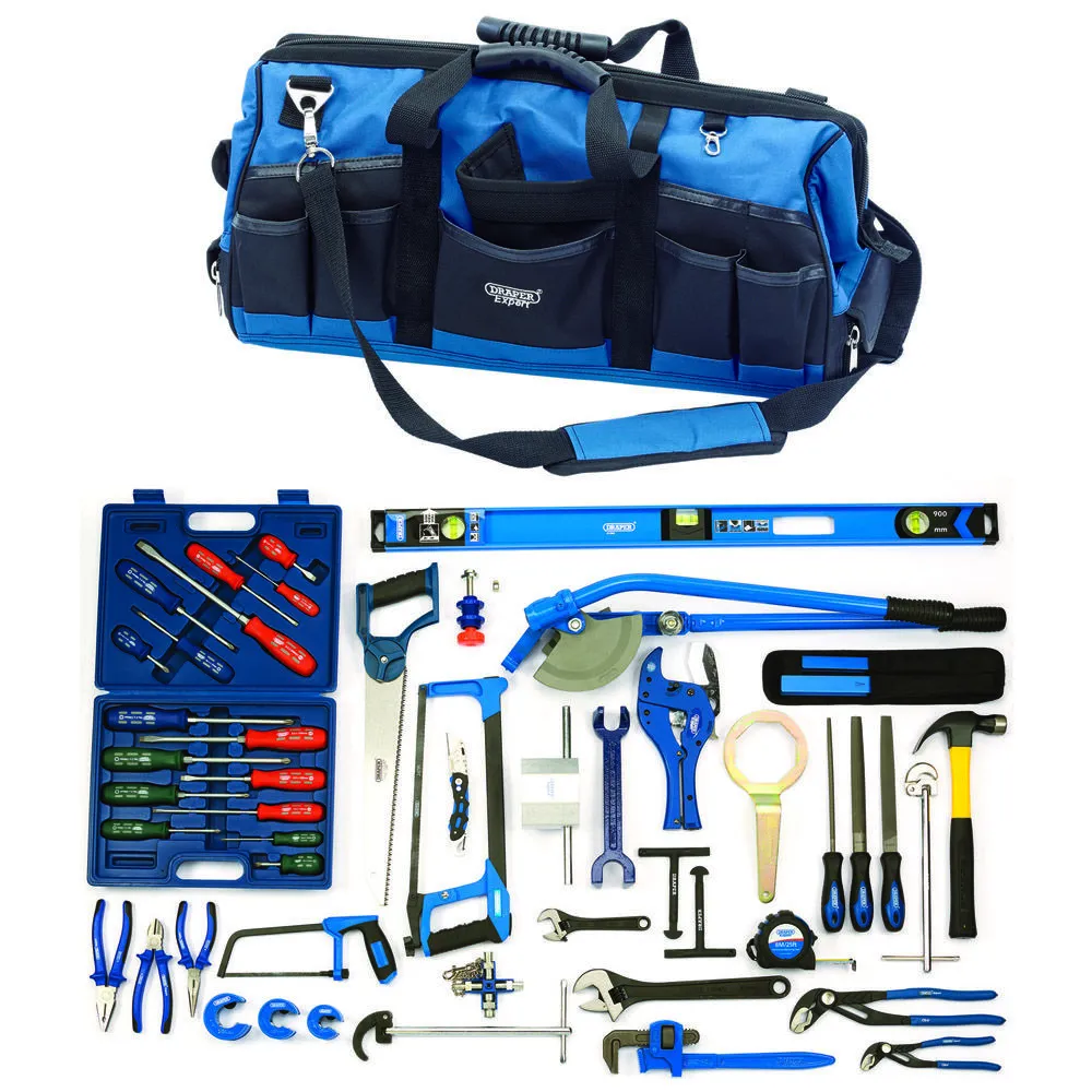 Comprehensive kit for plumbers supplied in a water resistant canvas tool bag.