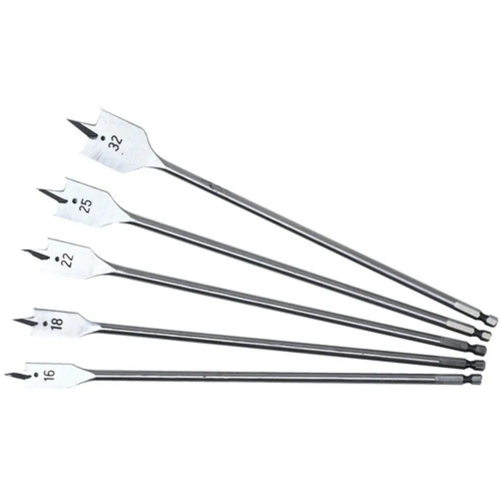 A good quality set of extra long flat wood bits, especially useful for drilling thicker material. These precision ground bits can be used in virtually any power drill (with standard 10mm or 13mm 3-jaw chuck) plus they can also be used in power tools with hex drive systems.