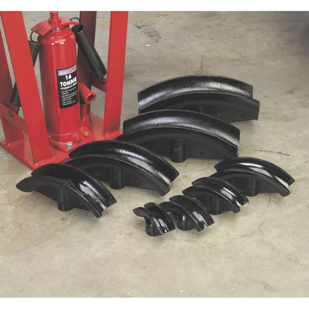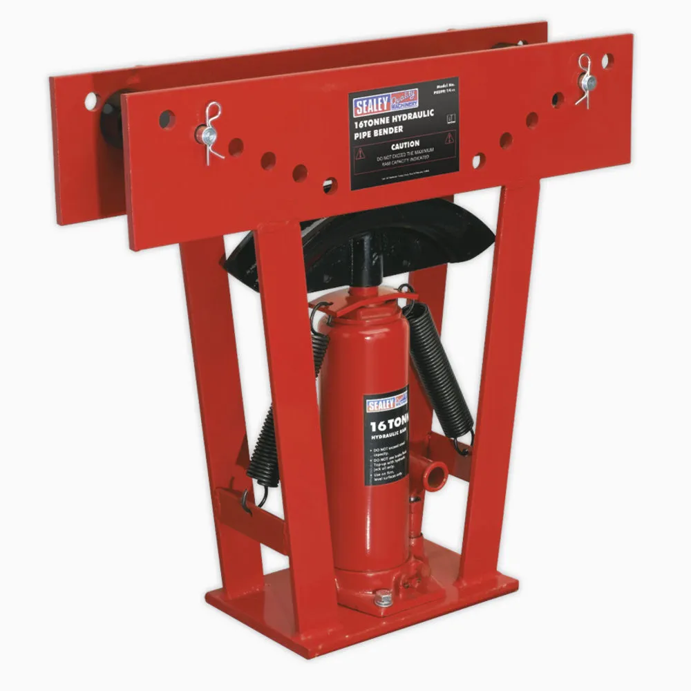 The Sealey hydraulic pipe bender is a floor standing pipe bender with fabricated steel chassis, heavy-duty 16 tonne hydraulics, and integral pump and reservoir. This model is suitable for bending gas and air pipe from 15mm up to 75mm and bends up to 180° (3 x 60°). Also included are eight steel dies to help prevent pipe distortion.