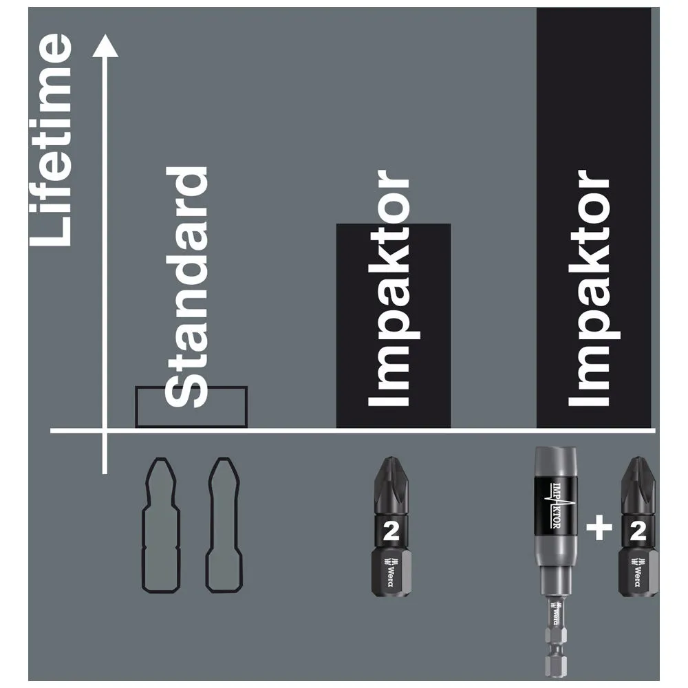 This pack of 15 Pozidrive PZ2 Impaktor bits 25mm long should be used with 897 4 IMP Holder for maximum service life.