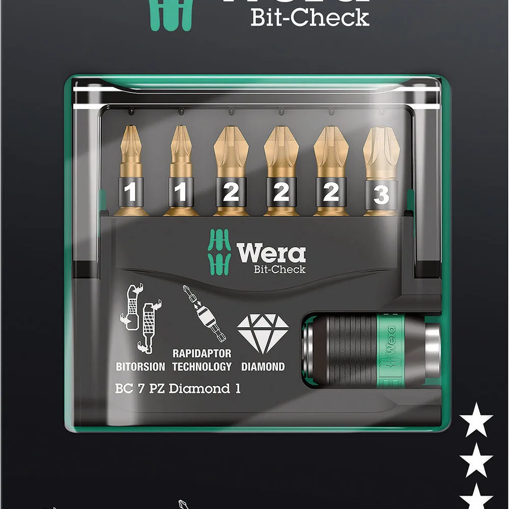 Wera Bit-Check 7 Diamond 1, with Rapidaptor is designed for compact and organized tool storage. Utilising a unique combination of special material, hardening and precision manufacture, BI-TORSION bits are designed to prevent premature wear and dramatically extend service life.