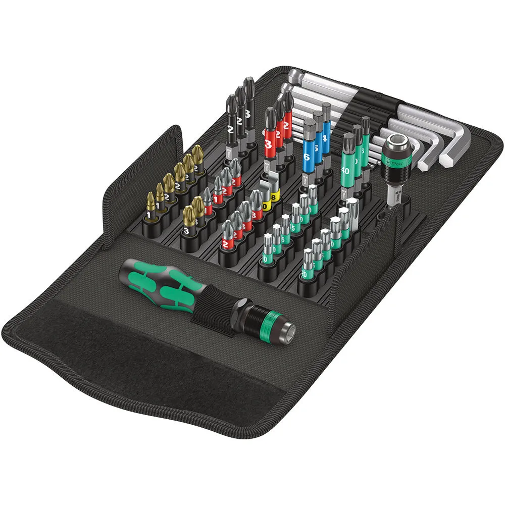 Presented in a compact pocket sized design to safely store bits and bit holders in a handy structured fabric case, the tools are easily accessed.